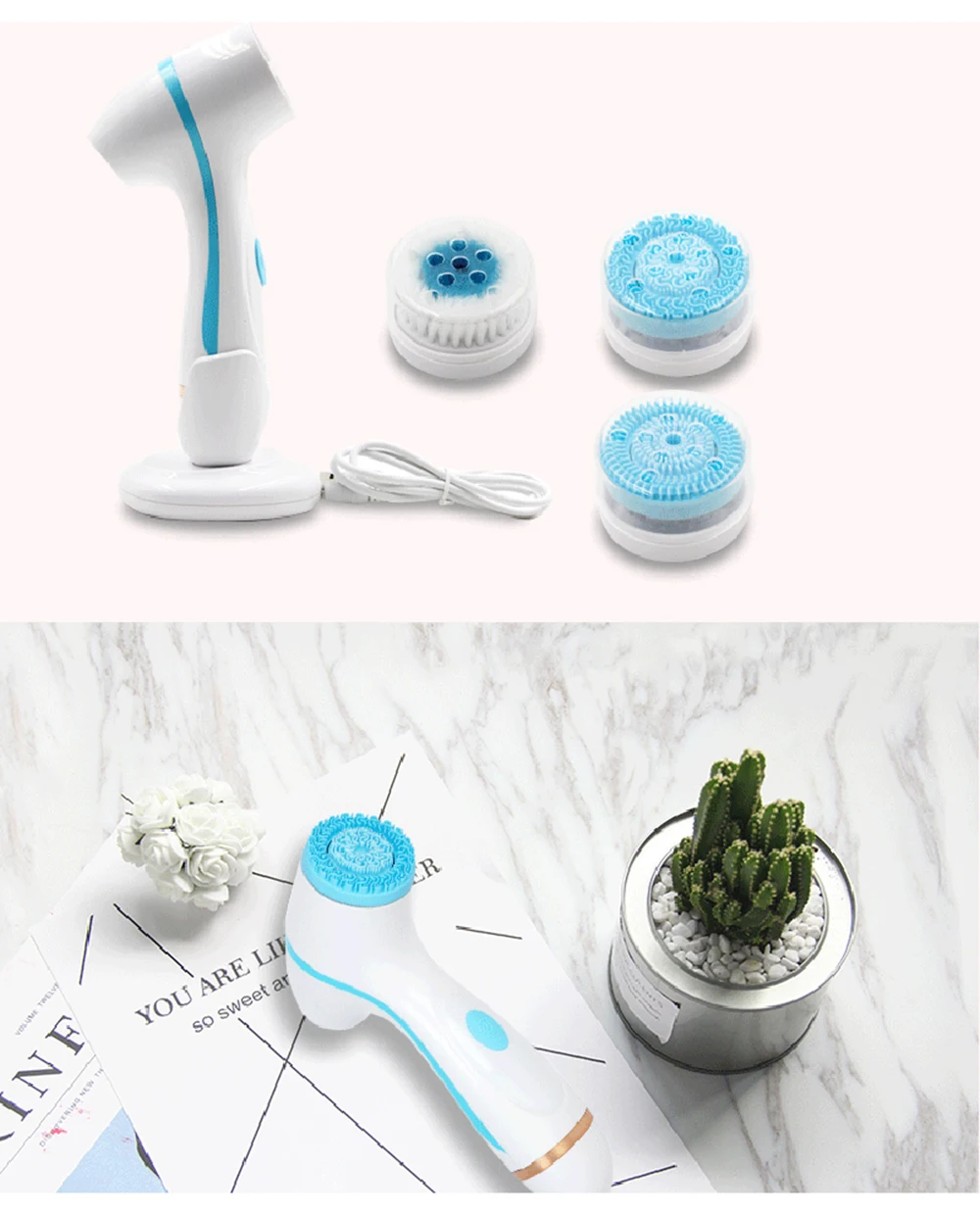 Three interchangeable brush heads allow customized care for different skin needs — from daily cleansing to deeper exfoliation.